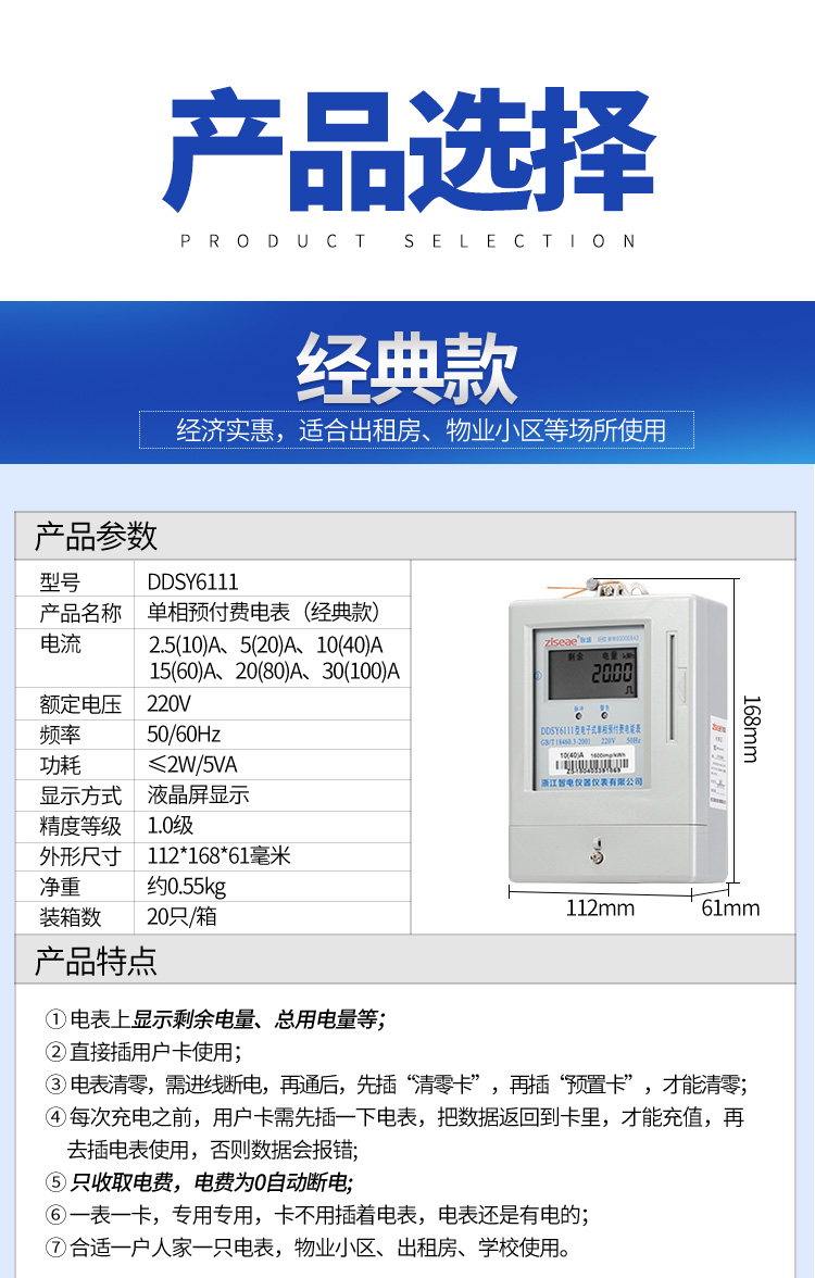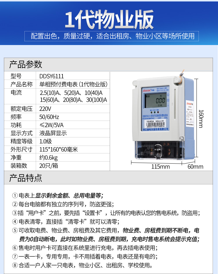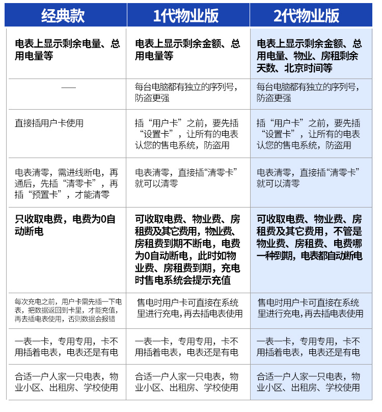 (2)預(yù)付費電表的功能:經(jīng)典款電表是上顯示剩余電量、總用電量等,1代物業(yè)版電表上顯示剩余于金額、總用電量等,2代物業(yè)版電表上顯示剩余金額、總用電量、物業(yè)、房租剩余天數(shù)、北京時間等具體功能如下。