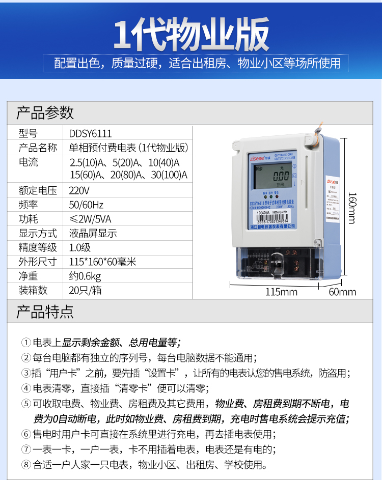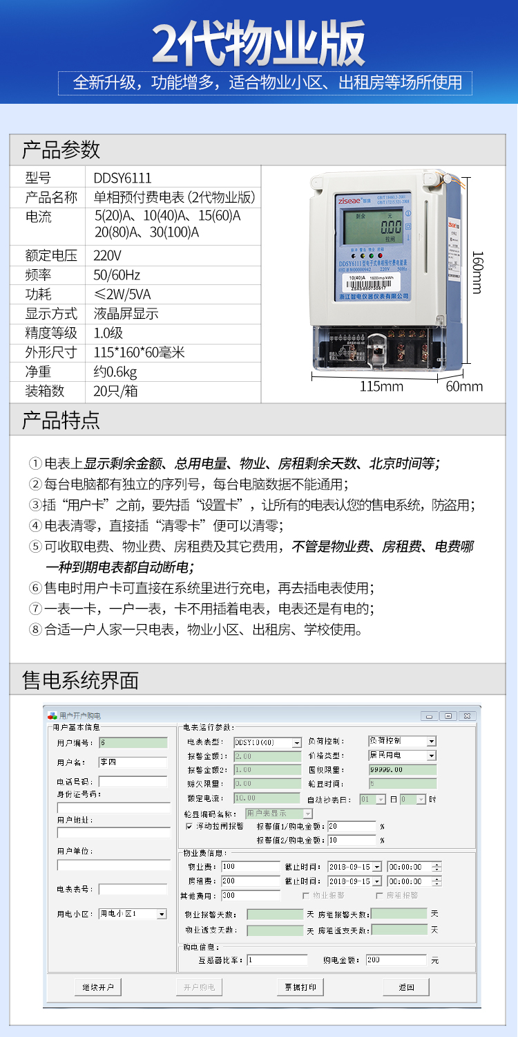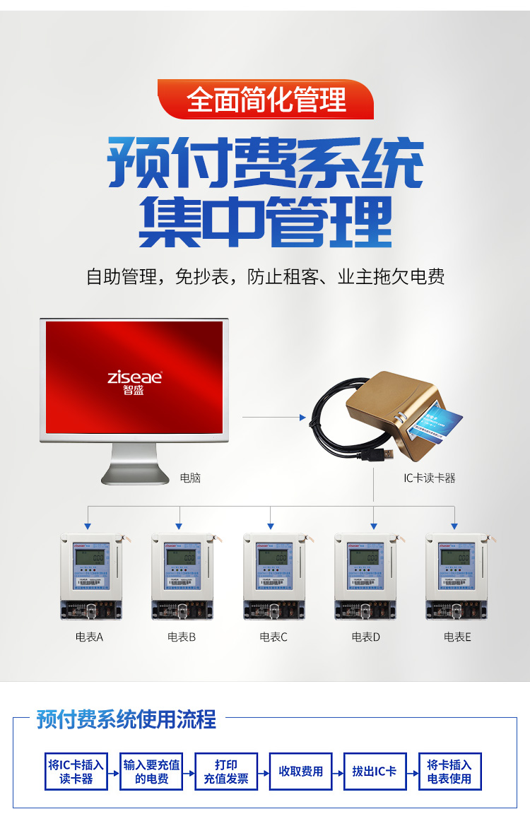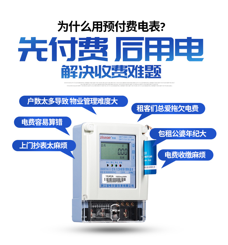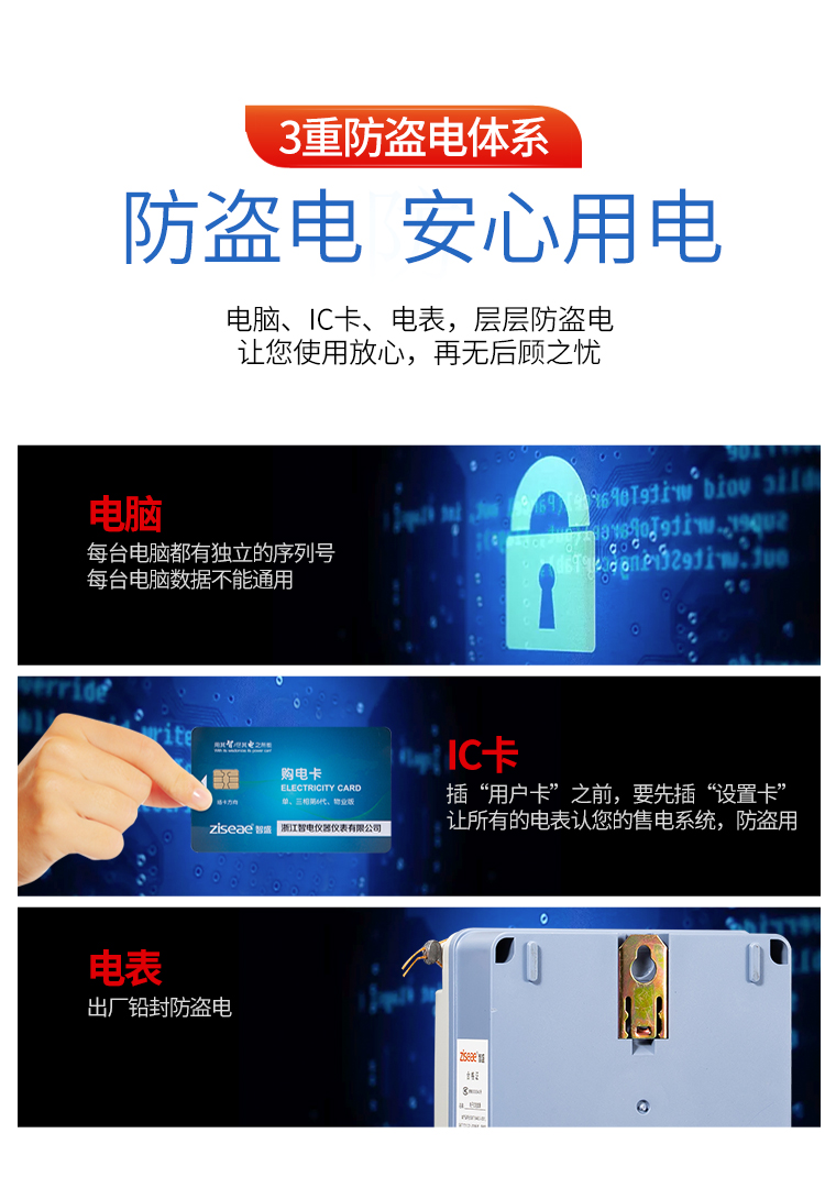 主要特點:應用計算機管理,先購電后用電;在額定電流范圍內能限制使用功率(由供電部門限定);一表一卡,專卡專用,失卡不失電,補卡再用;電卡能雙向傳遞數據,能自動斷電告警用戶購電;電量為零時,自動拉閘斷電;并具有一定的防竊電軟件設計等。
