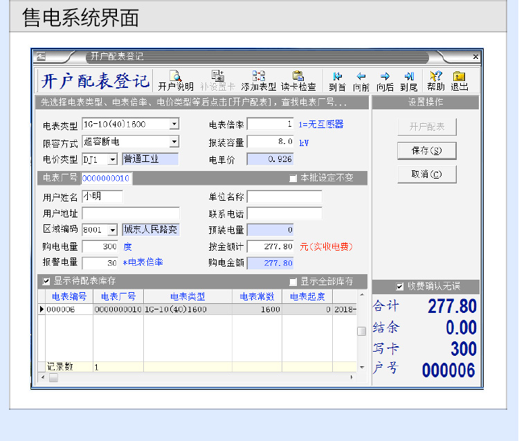 7、購電方式:售電時,將IC卡插入IC卡讀寫器,同時操作計算機,將用戶編號、預購電量、報警電量、限容方式及限容功率等加密寫入IC卡。